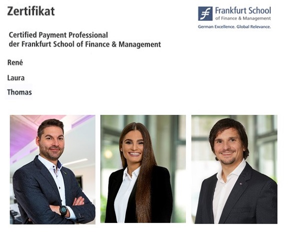 Bereits im letzten Jahr hat unsere ZV-Expertin Laura den zweiwöchigen Studiengang zum Certified Payment Professional an der Frankfurt School of Finance erfolgreich abgeschlossen und mit der Abschlussprüfung das zugehörige Zertifikat erworben. In diesem Jahr folgten ihr unsere beiden weiteren ZV-Experten René und Thomas und schloßen den Studiengang ebenfalls mit Zertifikat erfolgreich ab. In dem lehrreichen Studiengang erweiterten unsere ZV-Experten ihr theoretischens Wissen in den Bereichen Zahlungsverkehr in Deutschland und Europa, Zahlungsverkehr international sowie im dokumentären Zahlungsverkehr. Ebenfalls wurden neue Trendthemen behandelt und das Wissen im Bereich Cards, mobile Payments sowie Cash Management und E-Banking vertieft. Wir gratulieren den drei Kollegen und danken ihnen für die Zeit, die sie neben dem Studiengang in die Vorbereitung der Abschlussprüfung investiert haben.